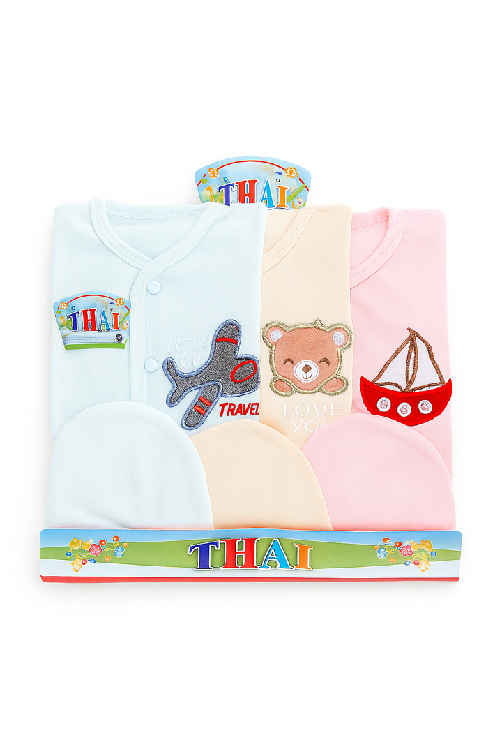 With fun embroidery featuring a teddy bear, boat, and airplane, and pastel-colored caps and pajamas, this unisex set is perfect for daily use, gifting, or as part of a newborn hospital bag.