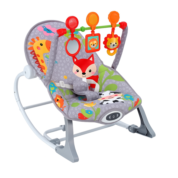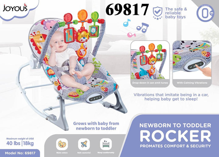 The Joyous Newborn to Toddler Rocker (Model 69817) is designed to keep your baby relaxed, entertained, and secure from day one. Featuring soothing vibrations that mimic a car ride and a musical toy bar, this rocker provides a comforting environment for your little one. Its adjustable reclining seat and strong steel frame ensure stability, while the soft, colorful animal print seat adds fun to your baby’s playtime.