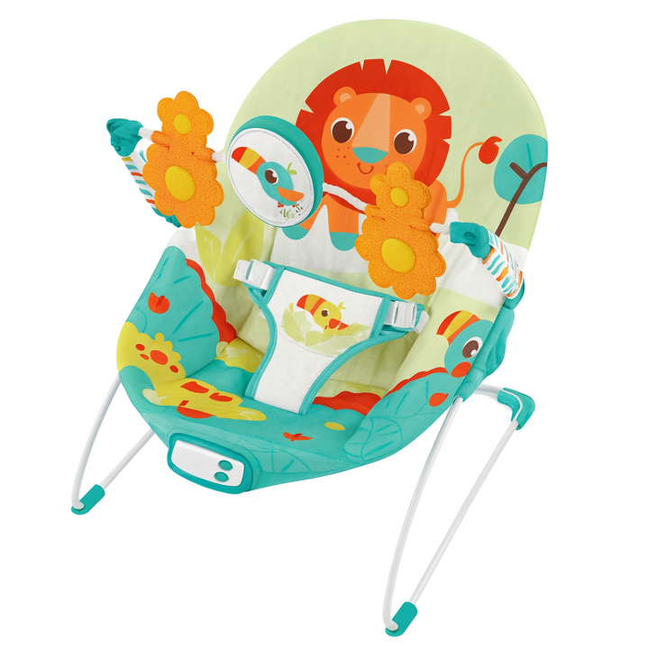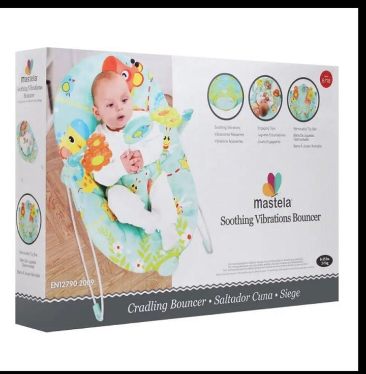 The Mastela Music & Vibrations Recline Bouncer is designed to keep your baby safe, comfortable, and entertained. Featuring a soft recline padded seat in a Printed Lion Green design, it combines safety and style perfectly.